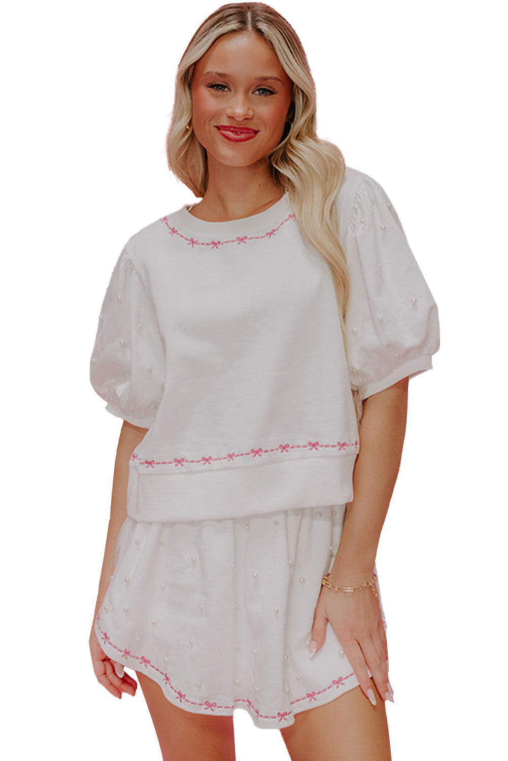 White Sweet Bow Trim Pearl Embellished Blouse and Skort Set