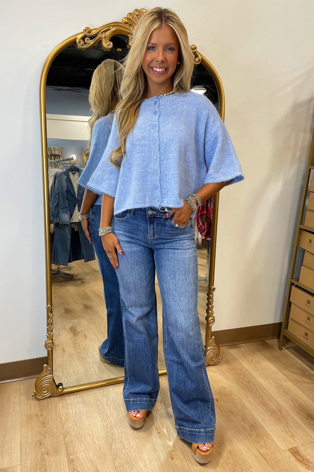 Beau Blue 3/4 Sleeve Boxy Knit Button Down Sweater Cardigan