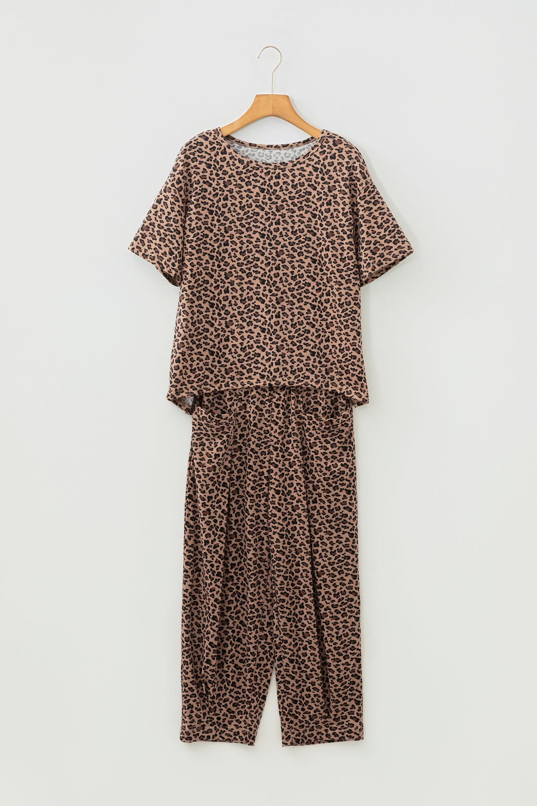 Brown Leopard Loose Tee Drawstring Waist Barrel Pants Set