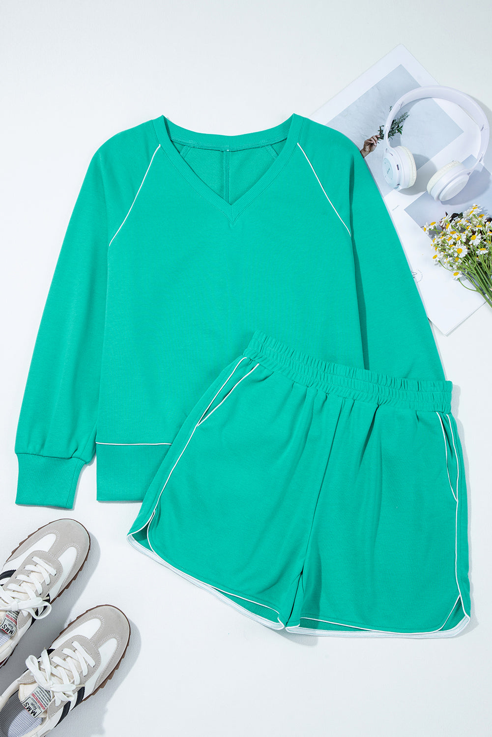 Dark Green V Neck Piping Trim Pullover Top and Shorts Set