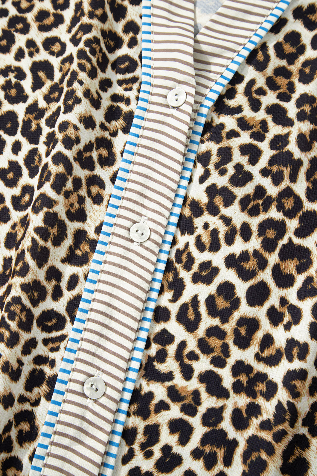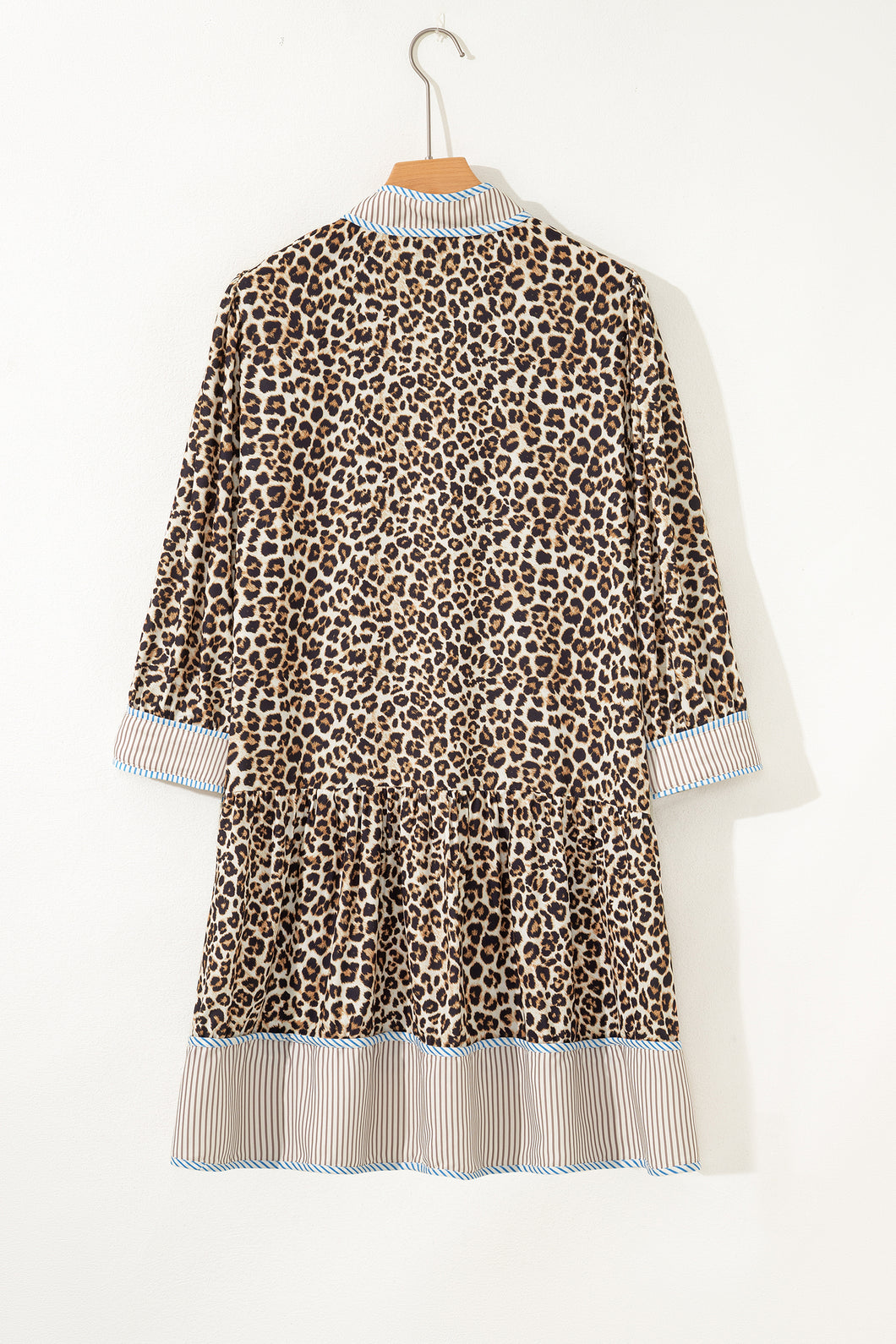 Khaki Plus Size Leopard Print Striped Trim V Neck Drop Waist Long Sleeve Mini Dress