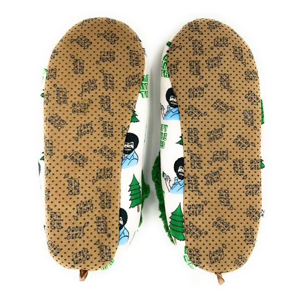 These printed Bob Ross with Lil Happy Trees are a fun and comfortable printed Indoor Slipper with extra padding and sherpa lined to help cushion your feet while keeping them warm