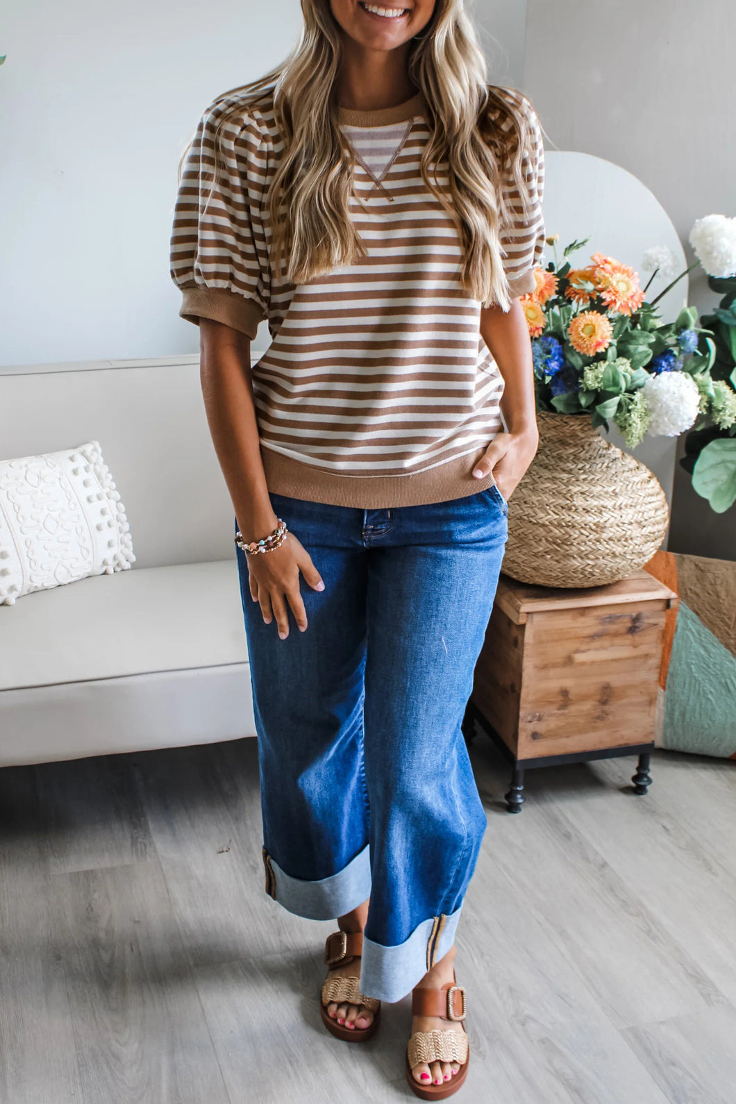 Striped T shirt features a classic pattern with playful short bubble sleeves.