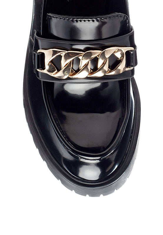 Pair of beautiful Loafers in patent faux leather in high quality construction and finish that is all stylish. Has metal chain buckle detail atop which adds to the look.