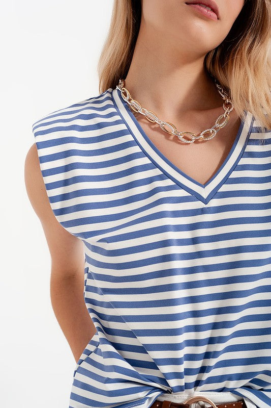 Top V neck padded shoulders sleeveless style regular fit soft and breathable 95% Cotton 5% Elastane Model is wearing size S. Model is: 32 24 35 Height: 5'9''. Runs true to size. Regular Fit. Stripe design V neck neckline Sleeveless style Relaxed fit Casual