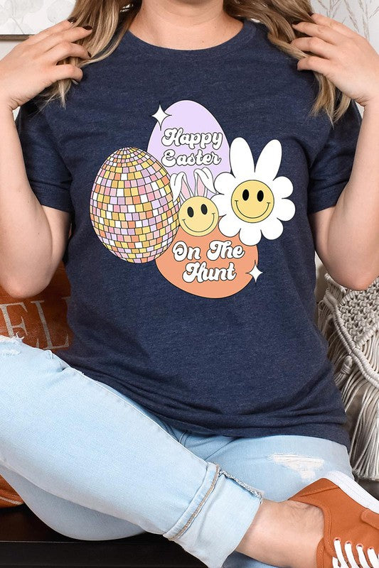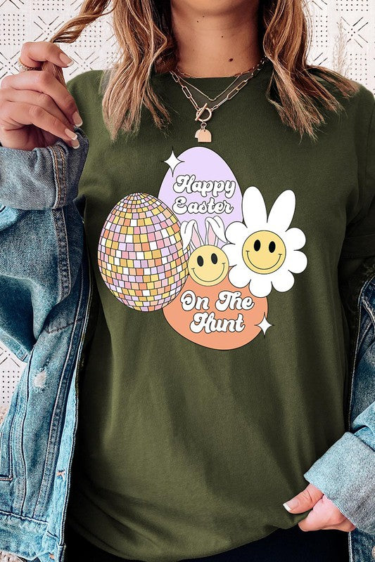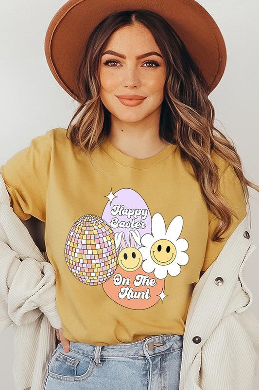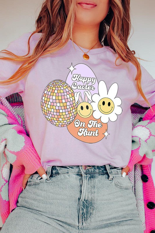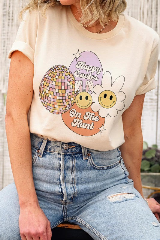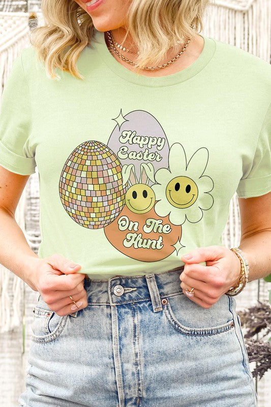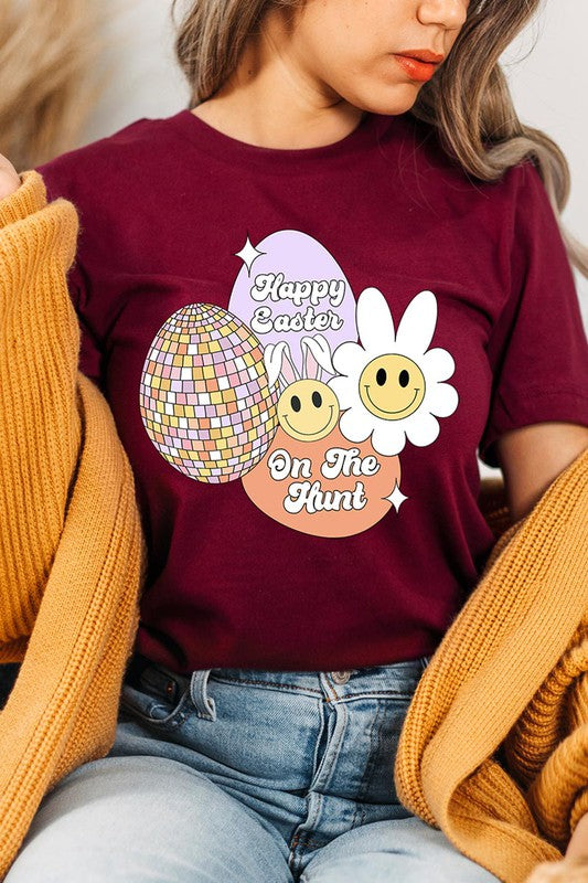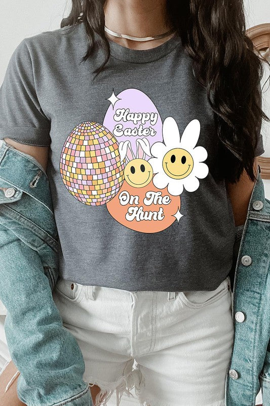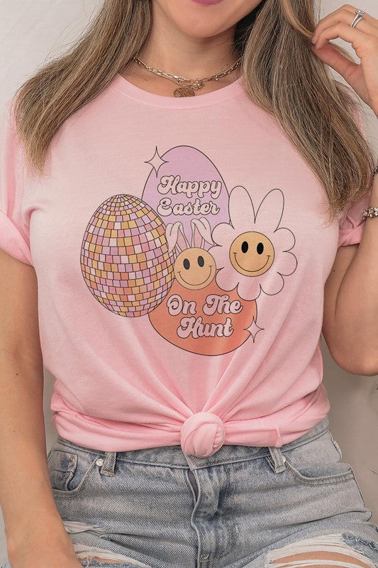 HAPPY EASTER ON HUNT,EGGS,BUNNY,SMILEY FACE UNISEX SHORT SLEEVE,GRAPHIC TEE,GRAPHIC TSHIRTS,TSHIRTS,TEES